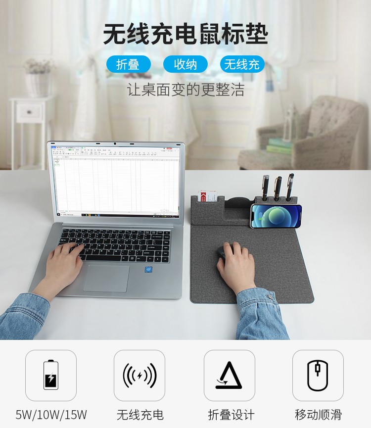 折疊支架款無(wú)線充電鼠標(biāo)墊可定制 布紋超薄無(wú)線充鼠標(biāo)墊可印LOGO